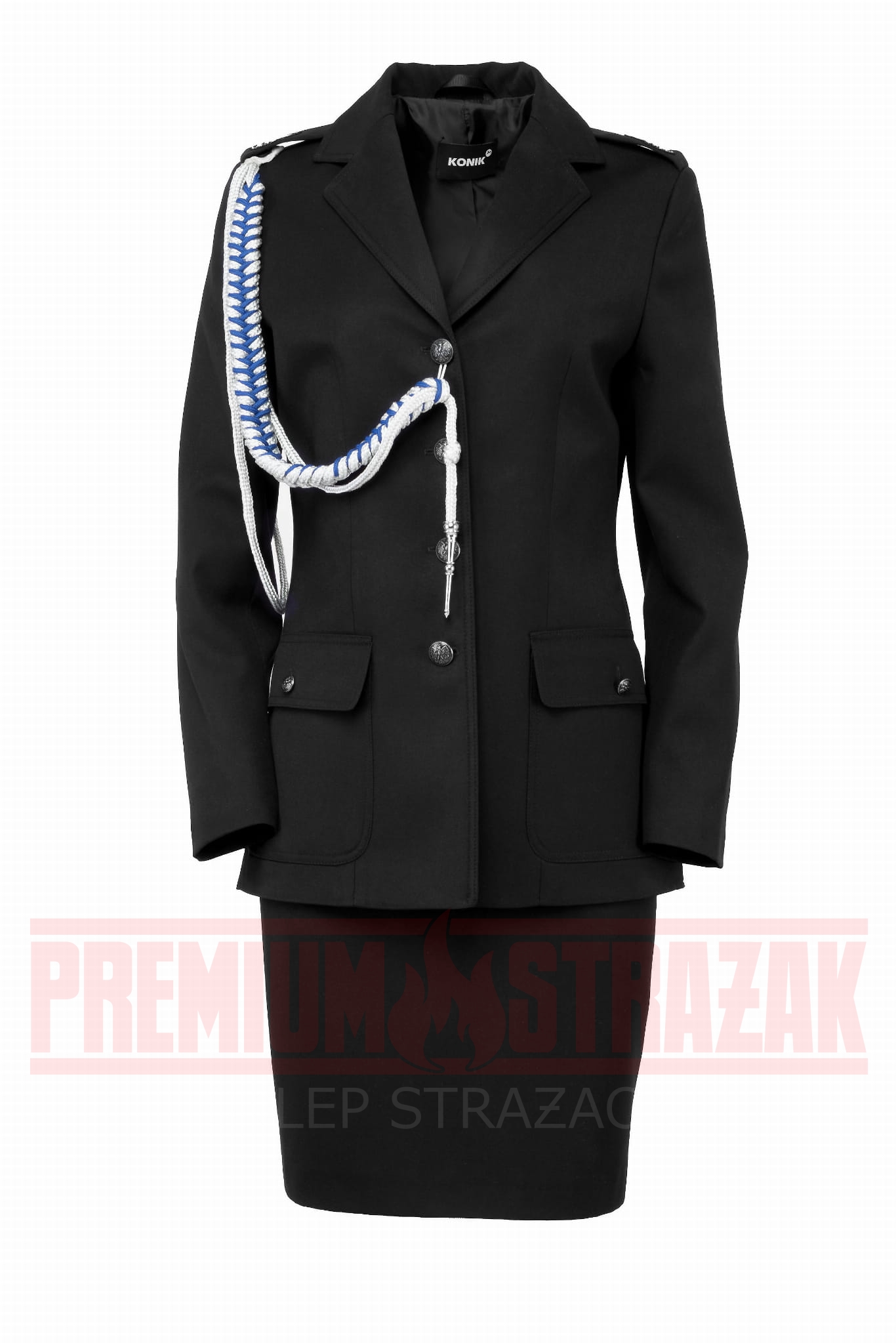 Mundur strażacki galowy, wyjściowy damski (marynarka + spódnica) produkowany jest z elanowiskozy zapewniający wysoki komfort użytkowania oraz łatwość pielęgnacji. Tkanina posiada dobrą przepuszczalność powietrza oraz dobrą odporność na wybarwianie. Kolor ciemnogranatowy, guziki oksydowane.